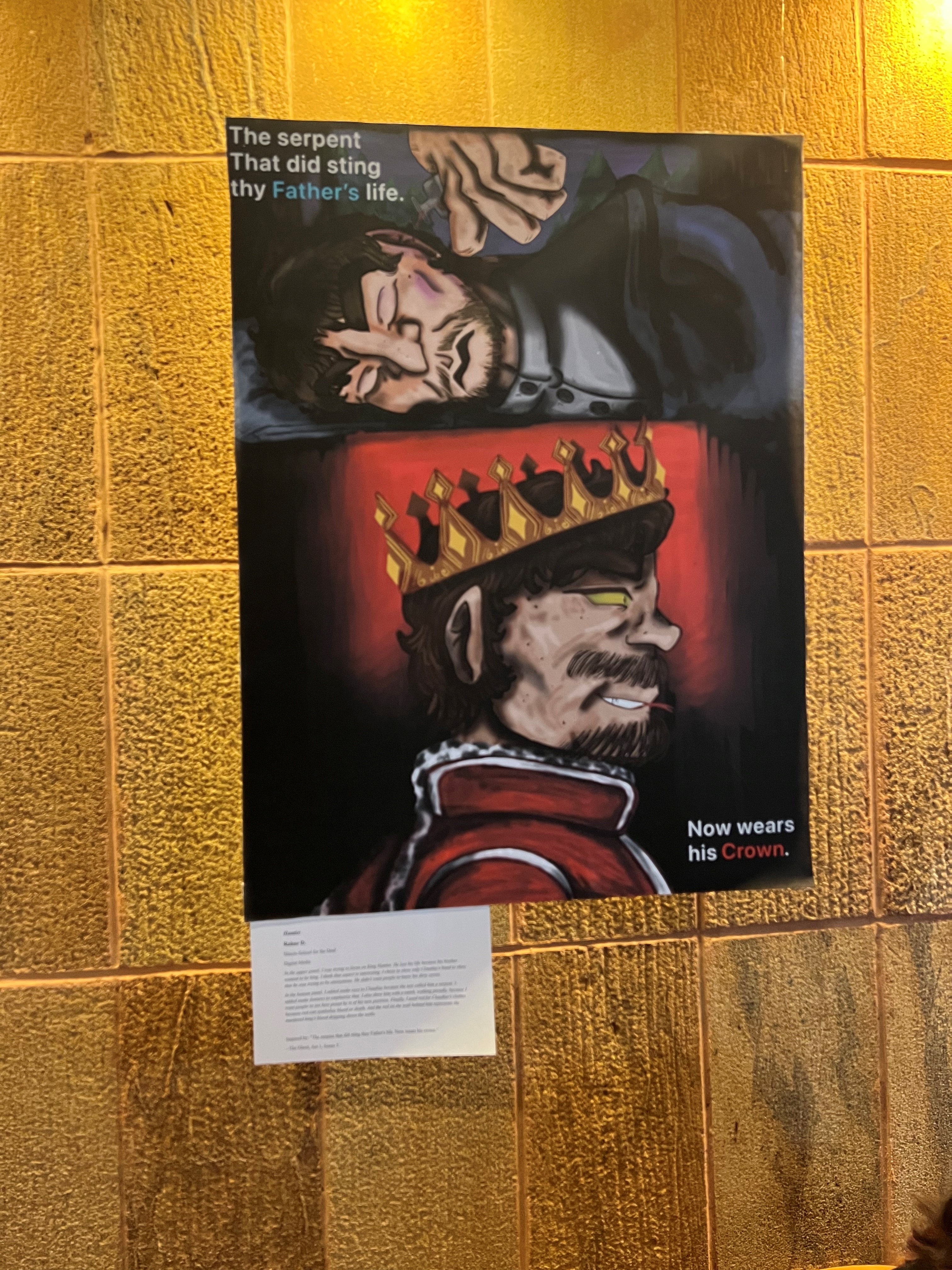 This winter, Chicago Shakespeare Theater held an art exhibition for students in connection with their Short Shakespeare! Hamlet production. Students were provided with several quotes from the play and asked to select one to use as inspiration for an original piece of art. Once artwork was submitted, Chicago Shakespeare Theater selected the top 20 pieces for display in the theater lobby, with all submissions being shared online. One of our high school students, Rahne, completed a piece of artwork based on the line “The serpent that did sting thy father’s life now wears his crown.” Rahne's art was selected as one of the 20 best pieces and prominently displayed in the lobby of the Courtyard Theater. Our students and staff were very excited to get to see the display during their field trip to the theater yesterday for the production of Hamlet! This was Rahne’s first time submitting her artwork to any kind of competition, but we’re sure it won’t be her last! Congratulations, Rahne! Thank you to Mrs. Grieme for organizing this field trip to see Short Shakespeare! each year and encouraging our students to not only read, analyze, and perform Shakespeare's work during literature class but to also create art inspired by his words!